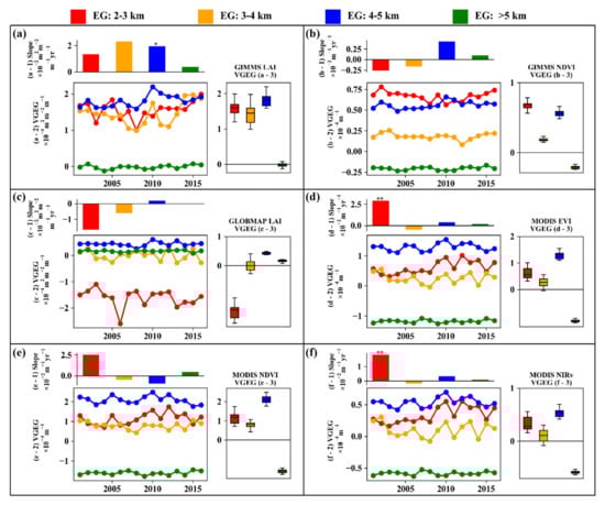 Trend of VGEGs in different elevations from 2001 to 2016 ((a): Global Inventory Modeling and Mapping Studies leaf area index (GIMMS LAI); (b): GIMMS Normalized Difference Vegetation Index (NDVI); (c): Global Mapping (GLOBMAP) LAI; (d): Moderate Resolution Imaging Spectroradiometer Enhanced VI (MODIS EVI); (e): MODIS NDVI; (f): MODIS near-infrared reflectance of vegetation (NIRv)). Take (a) as an example (the same meaning of panels b–f). a-1 is the slope of VGEG. a-2 is the mean annual VGEG value represented by circles of various colors at different elevations from 2001 to 2016. a-3 denotes the statistical values of VGEG, which share the same unit with a-2. The asterisks indicate that the slope is statistically significant (*: p < 0.05; **: p < 0.01).