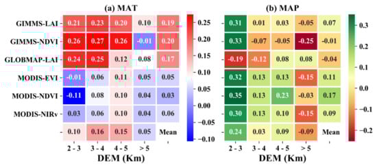 Correlation between vegetation indices (VIs) and climatic factors ((a) MAT (Mean Annual Temperature) and (b) MAP (Mean Annual Precipitation)) at the elevations of 2–3, 3–4, 4–5, and >5 km from 2001 to 2016.