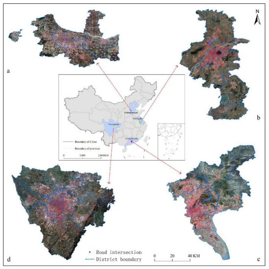 - In this paper, road intersections have been used to extract discretely distributed urban settlements and to identify the urban territorial scope. Because of the influence of large parks, green spaces, or arable land on the fringes of the cities, as well as suburban villages, there is a gap between the obtained area of urban settlement and the actual urban built-up area. Nonetheless, the method in this paper is simple and feasible, and the data adopted are easy to acquire. The results of identification are discrete urban settlements, which are closer, providing free data sources for this study.