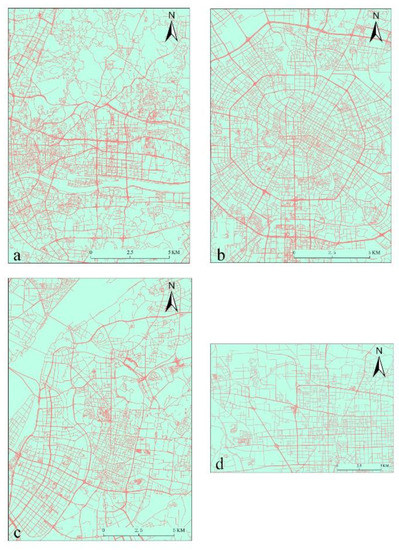 Urban road networks of Guangzhou (a), Chengdu (b), Nanjing (c), and Shijiazhuang (d).