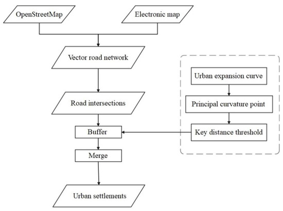 The method adopted in this paper mainly consists of three steps: (1) data preprocessing; (2) calculation of critical threshold; (3) extraction of urban settlements. The extraction of urban settlements is carried out as detailed in Figure 3. Firstly, the vector road network was obtained through OSM and electronic maps, and then the vector road network within the urban administrative region was figured out by using ArcGIS (ESRI, Redlands, CA, USA). This resulted in the creation of the set of road intersections. Secondly, the free software applications named Morphlim (https://sourcessup.renater.fr/morphlim/, accessed on 1 November 2020) [18,40] and ArcGIS were used to generate the urban expansion curve and to work out the principal curvature point and the key distance threshold. Finally, ArcGIS was used, with the key distance threshold as the buffer radius (to buffer and merge based on the set of road intersections) to obtain urban settlements.