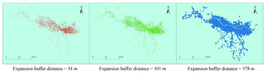 Tannier et al. [18] argued that the spatial organization structure within the city is like the fractal structure of Fourier Dusts, in which the actual city and street can be compared to black squares divided by white lines of a certain width. The number of white lines increases with the decrease in their respective widths. There is a strict hierarchical rule between the size and the number of white lines, and such a fractal feature can be measured by the Minkowski expansion method [56,57]. In other words, with the increase in the expansion buffer distance, the originally separated road intersections merge, and the urban settlements are gradually formed (see Figure 4). With further expansion, the number of urban settlements declines. Ultimately, all map spots merge, and the expansion terminates. The urban expansion curve is shown in Figure 5a, in which the horizontal axis indicates the expansion buffer distance, and the vertical axis indicates the number of urban settlements. According to fractal theory, the expansion buffer distance and the number of urban settlements conform to the power function law: