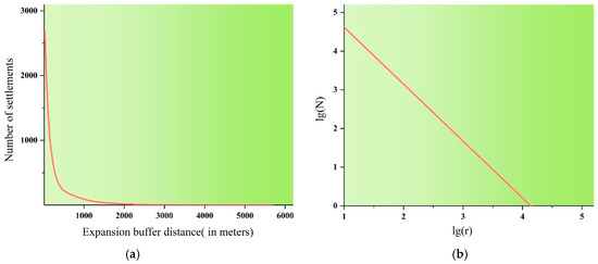 where N refers to the number of urban settlements, a is a constant, r refers to the expansion buffer distance, and D is the fractal dimension. If the logarithms of both sides of Equation (1) are taken simultaneously, the linear relation with D as the slope will be obtained (see Figure 5b)