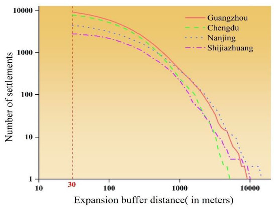 The urban expansion curve was constructed under different expansion buffer distances (30 m as the initial expansion buffer distance, and a continuous increase at an equal ratio of 1.1) using the road intersection data set of Guangzhou, Chengdu, Nanjing, and Shijiazhuang, until the map spots merged into a whole. The relationship (based on partial data) between the number of urban settlements and different expansion buffer distances in Guangzhou is shown in Table 1. It is obvious that with the increase in the distance threshold, the number of urban settlements generally showed a decreasing trend. With the increase in the distance from 30 to 325.2 m, the number of urban settlements declined from 9269 to 2193, and the urban settlement scale constantly expanded. The selection of an appropriate expansion buffer distance directly affects the identification result of urban settlements. To visually display the change characteristics and differences in the number of urban settlements under different expansion buffer distances in Guangzhou, Chengdu, Nanjing and Shijiazhuang, the expansion buffer distance, and the number of urban settlements in each region were plotted using logarithmic scale mapping as shown in Figure 6. From Figure 6, the changes in the number of urban settlements in the four cities all conformed to the power-law rule, and the shapes of their expansion curves had similarities and differences. The number of initial settlements was the largest in Guangzhou, followed by Chengdu, Nanjing and Shijiazhuang. With the increase in the expansion buffer distance, the number of settlements showed a constantly decreasing trend.