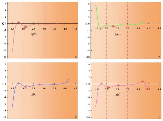 If a city is fractal, the number of its urban settlements is related to the distance threshold, which conforms to a strictly linear relation [63,64]. The true morphology of the city is not a fractal structure strictly following the rules, rather it has random pre-fractal and self-similarity on a limited level [59,65]. The fractal dimension is constant over a limited range, but it changes over a continuous range [66,67]. The power-law relationship between the measurement scale and the corresponding measure is valid only within a certain scale range, thus forming the so-called scaling range [59]. It is assumed that the point deviating from the straight line farthest in the expansion curve is a key distance threshold and corresponds to an urban agglomeration [18] that can separate two spatial forms, namely urban and rural areas. The corresponding principal curvature point can serve as a key point to divide the two spatial form subsets: the urban and rural areas.