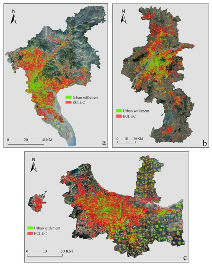 Therefore, it is more scientific to describe urban boundaries based on urban land use classification or fractal thoughts, that is, the urban territorial scope is viewed as discretely distributed urban land or urban settlements [18,29,40]. Data of EULUC-China-2018 (from http://data.ess.tsinghua.edu.cn/, accessed on 1 November 2020) was downloaded, and then ArcGIS was used to work out the data of Guangzhou, Chengdu, Nanjing, and Shijiazhuang, for comparisons with the results of this paper. It can be found that the discrete distribution patterns of the two results in the administrative space of the four cities are almost the same and that their areas of urban territorial scope in the results of EULUC-China are larger (see Figure 9a, Figure 10a–c). The areas of the urban territorial scopes of Guangzhou, Chengdu, Nanjing, and Shijiazhuang in the EULUC-China results are 1985.67 km2, 1200.51 km2, 1554.74 km2, and 776.25 km2, respectively. Compared with the data in China Urban Construction Statistical Yearbook 2018 (1300.01 km2, 931.58 km2, 817.39 km2, and 309.12 km2, respectively), the error rates of area estimation are 52.74%, 28.87%, 90.21%, and 151.12%, respectively. The areas of the four cities except Chengdu show anomalies.