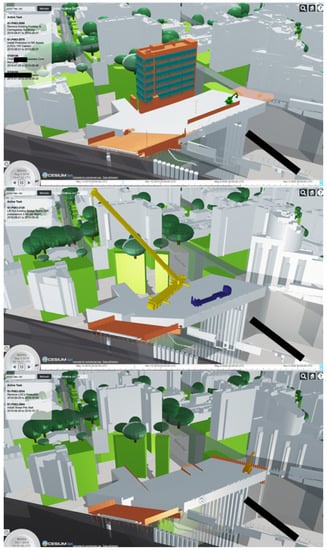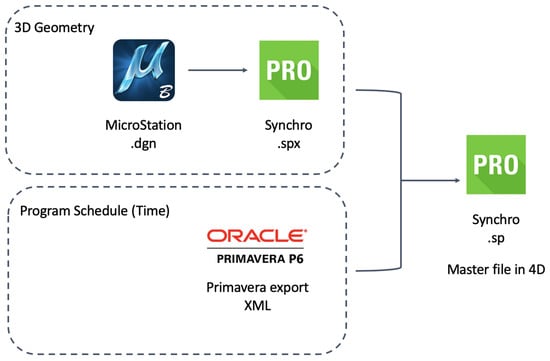Synchro is a suite of software for digital construction management which has one of its targets as improving the use of data to optimize decision-making, by helping to optimize complex construction projects across civil, building, and industrial sectors. Teams at the jobsite can access the information they need, tailored to the context in which they need it and can track and raise issues linking back to the central model and map views (https://www.bentley.com/en/products/brands/synchro?mkwid=s_pcrid_463398066647_pkw_synchro_pmt_p_pdv_c_slid__pgrid_108282245026_ptaid_kwd-172798762_&intent=&gclid=Cj0KCQjwuL_8BRCXARIsAGiC51C_Ipe-CUWMsLgAoud-U8HWoa_sCBRqfpH8ket2-CKUlVueAjajkcUaArPREALw_wcB (accessed on 20 October 2020)) The software is currently used by CSJV for 4D BIM construction scheduling and project management and a master data file for this research was provided in Synchro’s native .sp format. This contained the 3D geometry and program schedule of a key bridge project which included the closure of a bridge for five years while utilities were disconnected, surrounding buildings demolished and the bridge extended [35].