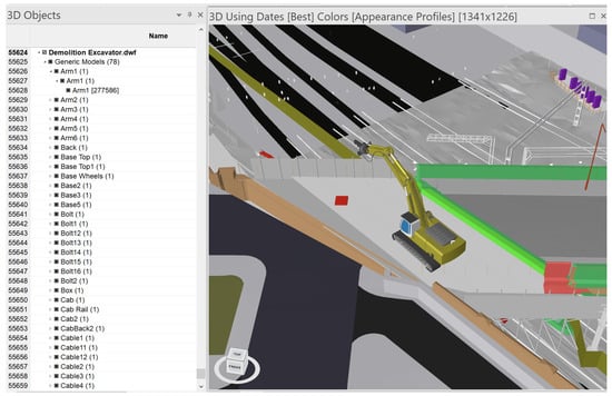 The 3D models represented physical objects related to the construction project, including machinery equipment, existing site and new installations. These 3D objects were assigned as resources, categorized as either equipment or material, and the resources were then assigned to corresponding tasks with time attributes attached. Using the resulting model, Synchro enables users to view and analyze construction sequences in 4D, with model visualized in 3D as well as in time dimension, to identify clash and conflicts in sequence or resource allocation. Additional context is provided by 3D models of the road, railway, greenspace and other objects (Figure 2 and Figure 3). As the demolition excavator model shown in Figure 3 shows, 3D objects are organized in a tree structure with different levels.