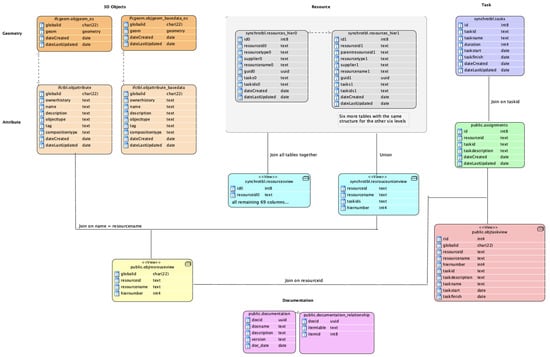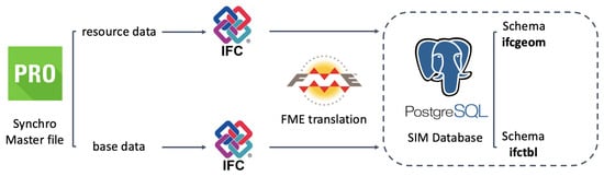Figure 4 shows an overview of the data migration process, which separately migrated the resource data (i.e., the schedule and associated geometry) and the background (base) data, by exporting both as IFC files, and then using FME to directly migrate them—feature class by feature class—into a PostgreSQL/PostGIS database. This results in a central repository for the data enabling multi-user, multi-software access with the option to control editing and visualisation permission. A centrally managed data store also facilitates queries between multiple data sources and facilitates backup and security management, allowing the data to be utilized for a diverse range of applications.