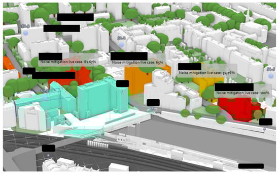 Statistics for the noise mitigation cases were reported in two ways: by symbolizing and labelling buildings with the percentage complete values (Figure 10) or by generating bar chart summarizing the number of live or completed cases at each stage for each building.