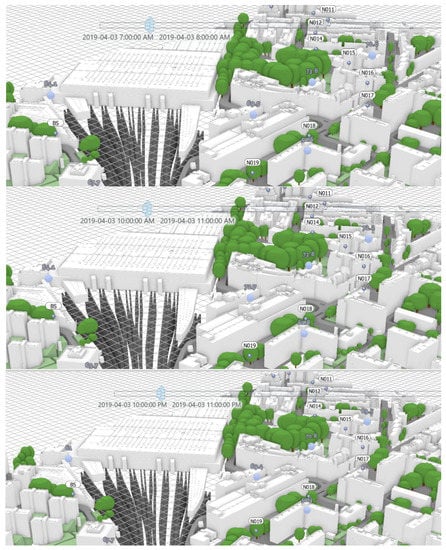 Figure 11 shows noise monitor locations represented as pins on the ground and labelled with monitor IDs (e.g., N015), and noise measurements at different times of the day represented by blue spheres elevated from the ground level for visualization purposes and labelled with measurement value in decibel level. Two types of time enabled data were displayed in this implementation: the 3D model with task schedule, and the average noise measurement varying by time of the day, days of the week. As changes in noise measurement were provided at hourly intervals while changes in the task were provided on a daily or weekly schedule, playing the time slider animation at the same speed throughout the project was found not to be effective, with the manual time-slider option preferred.