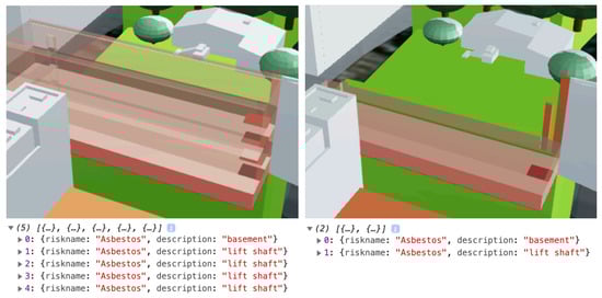 Active risks were time enabled and risk information was printed to the console when an active risk was within a buffer area defined by right-clicking. As the building is being demolished, the remaining locations of any asbestos were updated and the risk information included in the information returned by the buffer, as shown in Figure 13.