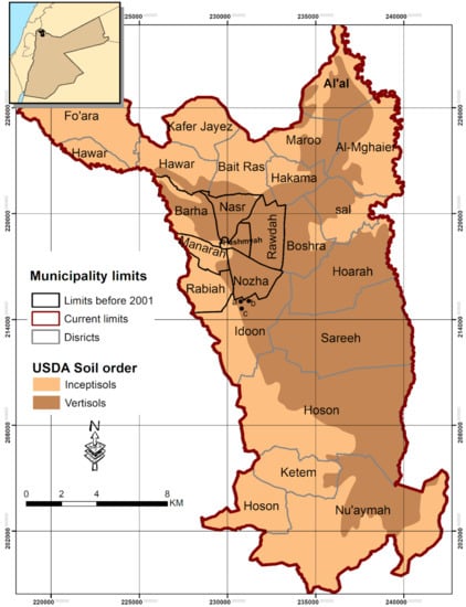 - Al-Qudah, B. Soils of Jordan. In Soil Resources of Southern and Eastern Mediterranean Countries; Zdruli, P., Steduto, P., Montanarella, L., Eds.; CIHEAM/Istituto Agronomico Mediterraneo di Bari (IAMB): Bari, Italy, 2001; pp. 127–141. [Google Scholar]