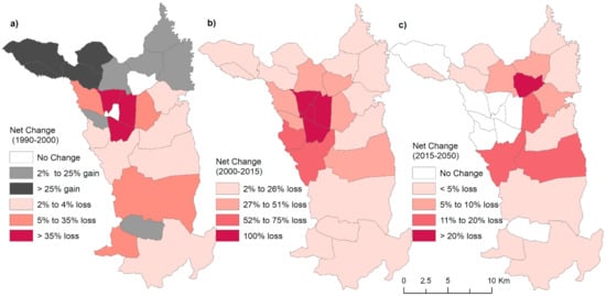 | Land Cover | Area | Change 1972–1980 | Area | Change 1980–1990 | Area | Change 1990–2000 | Area | Change 2000–2015 | Area | Change 2015–2050 | Area | % of 2050 Area | 78-year Change (%) |