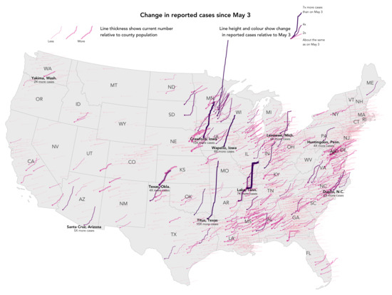 As this design work continued, various glyphmaps emerged demonstrating how spatiotemporal patterns in area-level cases data could be represented simultaneously. These glyphmap designs appeared to convey the sorts of detailed, multivariate spatiotemporal structure relevant to the analysis of COVID-19 identified in our Data Requirements (DatRs). For example, Mathieu Rajerison [6] used lines to signify cumulative case trajectories in France, located at the centroid of départments, with emphasis placed on départments experiencing rapid growth in absolute cases using animation. The same encoding was used by Michal Škop to represent area-level case data for the Czech Republic, with the addition that overall case numbers are also double-encoded using colour lightness as well as height [10]. Reis Thebault and Abigail Hauslohener, of The Washington Post, published a similar visualization for US counties [19], a version of the graphic is in Figure 1. In addition to annotating counties with distinctive growth rates, the authors used colour value and thickness to encode growth rates and relative exposure (current cases as a share of the population), respectively.