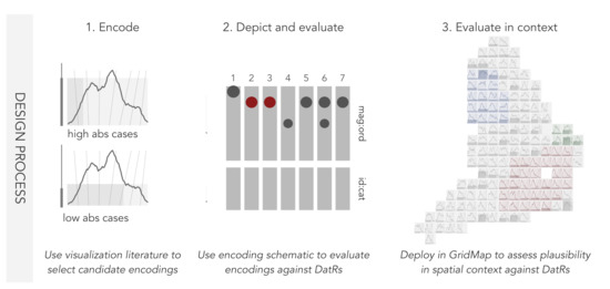 In this paper, we develop several glyphmap design candidates for representing COVID-19 cases data and, in a similar way to the Washington Post example, pay particular attention to how the glyphs might be parameterised and layered to build data density and reveal important structure. Developing design candidates, where multiple solutions are generated to meet analysis requirements, is an important aspect of visual data analysis [22]. How to evaluate and select the ‘best’ candidates is not straightforward. Upstream evaluation involves discussing low-level design choices, applying cognitive and perceptual principles to ensure that guidelines around effective visualization design are not violated. Downstream evaluation involves soliciting feedback from target ‘end-users’ and selecting designs based on this discussion [23]. A category of downstream evaluation that lends itself particularly to DesR4—whether the discussed chart idioms [24] encode quantities in a way that can be accurately estimated—is the perception-based experiment (e.g., [25]), which is a particular challenge for geographic contexts [26]. We reserve this for future work and instead focus on the upstream encoding threat—the possibility of violating cognitive and perceptual principles—as it is especially relevant to the sorts of applied visualization projects envisaged, where graphics are encoded with multiple data items at the same time. Our encoding schematics provide a novel framework for structuring this design candidate evaluation. Although the data on which our designs are based is limited to English local authorities, the designs could transfer to country settings other than the UK and analysis domains other than Epidemiology.