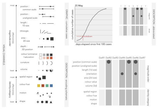 Visualization design is ultimately a process of decision-making. Data relevant to an analysis use case must be filtered and prioritised before being matched to visual channels [24] (Figure 3) through which components of a data graphic can be encoded. Certain visual channels are more effective at encoding certain types of data than others—and so judicious decisions must be made around which data to encode with which visual channel [24,32]. For data rich graphics where several data items are to be encoded simultaneously, as in the Washington Post example, these decisions become increasingly challenging.