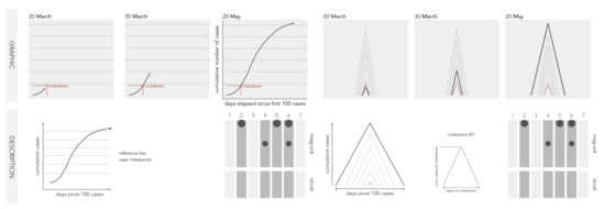 We explore two chart idioms for designing to the seven DatRs: line and ridge contour charts (Figure 4). The line chart requires little explanation. DatR5 time elapsed, the number of days since the first 100 cases was recorded, is encoded along the horizontal axis; the cumulative number of daily cases (DatR2) is encoded along the vertical axis; and a line connecting daily cumulative case counts is drawn in temporal order. The chart can be static and display the full case history (DatR6) or designed to animate over the cases data, as demonstrated via the frames in Figure 4. The ridge contour charts attempt to encode loosely the same data properties as the lines. They were proposed as an abstraction for emphasising comparison across particular aspects of our Data Requirements. For example, whilst line charts are the ‘obvious‘ approach to encoding the full temporal trajectory of the virus, comparison of absolute (DatR2) and relative (DatR3) case counts or emphasising particular milestones in the disease trajectory (DatR6 case history) is also important. There is precedent in cartography for using ridge symbolisation for encoding quantities [35] and the different ridge shapes that result from varying ridge width and height according to separate data items—thin and short, thin and tall, short and wide, tall and wide—might provide convenient visual short-hands. In our ridge charts, linear time varies along the horizontal axis and frequency along the vertical. Rather than a single line connecting points in temporal order, a separate line is drawn for each frame (release of cases data), similar to the ‘lockdown’ annotation in the line chart, but connecting positions on the horizontal and vertical axes to contrive a triangle or ridge shape. Case history is therefore encoded via animating over the ‘current’ frame, which is made bold and also through the case milestones that persist through the animation. The case milestones are a form of visual benchmark used frequently in cartographic contexts [36], and appear at regular intervals—every 1000 cases in this instance. Milestones located close together imply a fast rate of change (DatR5) and milestones further apart imply a slow rate of change; it is for this reason that we name them contours.