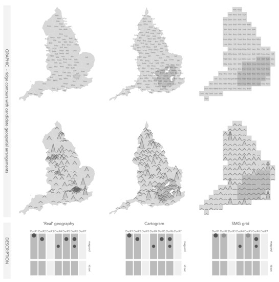 There are several options for incorporating spatial context within our designs. In the top row of Figure 5 are three candidates: an ‘exact’ arrangement, with local authorities positioned according to their true geographic location (at local authority centroids), a continuous area cartogram layout with local authorities distorted according to population size [37]; and a semi-spatial ordering with local authorities of regular size and geometry (grid squares) but with an approximate spatial arrangement (e.g., [38,39]). Each is presented using the ridge contour design and encoding described in Figure 4 and with accompanying encoding schematics.