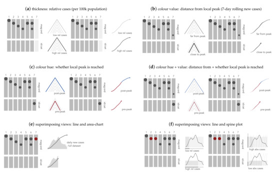 Figure 6 presents several design candidates that address this challenge with additional encodings selected through considering the schematics. In each, DatR3 relative number of cases is encoded using line thickness—length (1D size) according to the schematic, and although less effective than position, an appropriate visual channel for communicating quantities. Figure 6b–d encode aspects of DatR7 cases relative to ‘peak’ using colour. Here a local ‘peak’ is used, which is the point in time when the largest reported number of daily cases, expressed as a 7-day rolling average, is recorded. In Figure 6b distance in reported 7-day rolling cases to/from this peak is mapped to a continuous scale and encoded using colour value. The darker the colour, the closer the current point in the animation is to this peak—the bold line for the ridge contours and the most recent observation (and dot) for the lines. So in the two rows demonstrating two time slices in Figure 6b, the ridge in the first row is light grey (current new cases recorded are much less than the peak) and the ridge in the second row is dark grey (current new cases recorded are almost at the peak). Note that from the ordering in Figure 3, colour value is a less effective visual channel for encoding quantities and the encoding schematic reflects this—a small dot appears low down in the DatR7 column. In Figure 6c, DatR7 cases relative to ‘peak’ is treated as a categorical variable and encoded using colour hue, an appropriate visual channel for categorical data and reflected in the DatR7 column of the schematic. Where the current point in time is pre-peak, the ridge or line is coloured red, where it is post-peak, it is coloured blue. In Figure 6d, distance from the peak is mapped to a diverging scheme—colour hue to distinguish whether the current point in time is pre- or post- peak and colour value according to distance from this peak. Again, the encoding schematic is updated to reflect this with two dots now appearing in the DatR7 column.