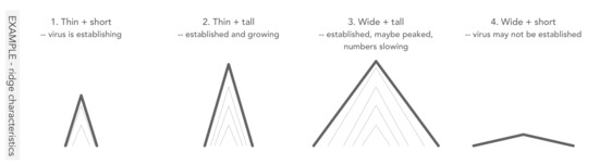 When conceiving of the ridge contours, we felt they might provide a unique and efficient visual short-hard for conveying case extent—absolute number of cases relative to time that the virus has been present in a local authority. For example, ridge contours that are thin and short suggest the virus is establishing and growing, thin and tall that the virus is established but still growing, wide and tall that the virus is established but has probably peaked with case numbers slowing, wide and small that the virus may not be established and that case numbers may be slowing (Figure 7). Once the encoding is learnt, it is possible to identify some of these categories of virus extent particularly in the animated version of Figure 8, which applies the encoding described in Figure 6a as full glyphmaps. The symbolisation used in the ridges (emerging peaks) also draws attention to the height encoding (case frequency) and the density in the milestone contours is read almost pre-attentively, which again supports judgements around virus extent. The occlusion that the encoding introduces serves to emphasise local authorities that contain the largest case counts—Kent, Lancashire, Essex—at the expense of authorities positioned in rows immediately above those authorities. This sort of interference between data items could easily be avoided in our smwg layout by ensuring that ridges and lines do not extend beyond their own grid cells. However, we wish to provide additional emphasis to local authorities with particularly high case counts and so allowing ridges to encroach on neighbouring cells is a deliberate design decision. Since line thickness varies according to relative number of cases (DatR3), the occlusion effect is even greater for those local authorities with populations particularly exposed to the virus—in Lancashire and the north west for example. The same is nevertheless true of the more familiar line equivalent, where patterns in virus presence, and additional information on growth, can be read more directly from line heights and slopes.