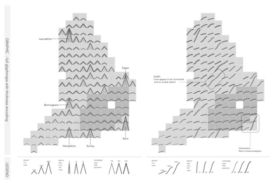 In this section, we describe our glymphmap designs for analysing local authority-level COVID-19 cases data in detail. We introduce a mechanism for describing our designs, which we call encoding schematics. These schematics are then used to document and assess the design choices made when creating glyhmaps of increasing data density. As is often the case, increased data density results in problems of occlusion and clutter, particularly in this case where there is a requirement to represent multiple features of the case data (DatR2-DatR7) for local authorities with a geospatial arrangement (DatR1). We reflect on this and layout options which involve relaxing geography, overcoming the occlusion problems at the expense of geographic precision, demonstrating the kind of design exposition [30,31] that we use to guide our design process (Figure 2).