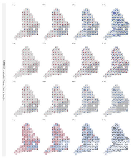 Finally, we make targeted recommendations linking candidate designs to data display and analysis needs. We do not offer a single design recommendation and it may be necessary to flexibly vary designs according to data analysis needs—to prioritise and bring certain data items into focus, a theme that we have previously identified for multivariate geovisualization [44]. Through our design exposition and discussion, we do however present a process for guiding visualization design leading to novel data graphics that successfully characterise detailed structure in the daily cases data for UK local authorities, and that reveals a striking geography. This activity seems prescient even to the current moment in the pandemic, enabling us to see the varying spatiotemporal character of infection and to design appropriate visualizations as data and needs evolve.