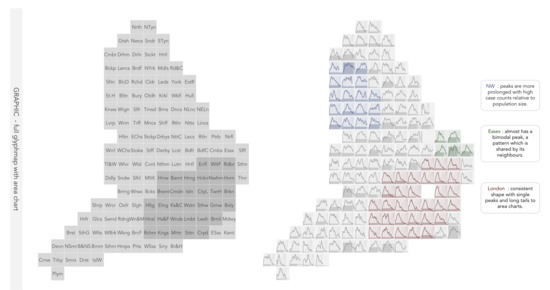 The ‘exact’ arrangement has the obvious benefit of being highly recognisable, enabling authorities to be easily located and perhaps regional grouping and comparisons to be more accurately and quickly performed. The obvious deficiency is the cluttering and occlusion in more densely populated parts of the country and particularly London—this layout clearly violates DesR2 Discernible. The cartogram is a substantial improvement, but does not entirely solve the problems of clutter and occlusion. Additionally, since aspects of population size are intrinsic to our data graphics (e.g., Figure 6) there is not a strong case to distort local authorities according to population size in the same way as one might an electoral cartogram of voting outcomes. The grid layout, a geospatial small multiple with gaps (smwg) [38], is the least recognisable. Departing from England’s familiar geometry means an additional overhead in terms of learning the layout. Additionally, due to the fact that regular squares are used, not all adjacency relationships between local authorities are preserved [38,39,40,41]. This fact is likely to interfere with judgements around spatial dependence, which as demonstrated by the Washington Post graphic [19], is an important factor when monitoring the spread and development of COVID-19. There are, though, several additional benefits conferred from the use of regularly-sized grids. Firstly, the grids allow more visually complex and detailed re-designs. In Figure 10, we use the full grid space to superimpose several chart types that encode directly cumulative cases and new daily reported cases, this greatly helps with meeting DesR1 Concurrent, though compromising DatR1 geography. Secondly, the grid layout may also better support positional judgements for the two key quantitative measures—time elapsed (horizontal position) and cumulative cases (vertical position). When glyphs are spatially arranged, this positional encoding is a secondary and inferior one (unaligned scale), as represented by the encoding schematics where the encoding for DatR2 absolute number and DatR5 time elapsed is bumped down one row. For the smwg grid layout, however, aligned comparisons of ridge heights is almost possible along the rows and, perhaps less obviously, of ridge widths along the columns. This slight difference is represented in the encoding schematic by making the mark outlines for DatR2 and DatR5 light grey and positioning them on the row representing position (common scale). This elevates smwgs above the cartogram and ‘real’ geographies on the effectiveness of encoding it affords (DesR4 Estimable), and we opt for the smwg layout for the remainder of the paper.