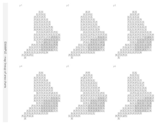 Whilst the data are novel, the visualization challenge is familiar. Temporal patterns (that are linear) are often best enabled using standard time-series charts and aligned scales, where time progresses along a horizontal axis and the quantity of interest is represented along a vertical axis. With a 2D geospatial arrangement, horizontal and vertical position is already in use and instead temporal analysis must be effected via other means. For example, via difference representation [14], creating a single ‘change’ statistic between two points in time and displaying the measure directly as a change map [14]; animation, representing each time cut as a frame on a thematic map; introducing a third dimension on which time might be represented (e.g., space-time-cubes [15]); or by generating discrete time series graphics for each spatial unit, using established idioms such as line charts, and applying a 2D geospatial arrangement to form glyphmaps [12].