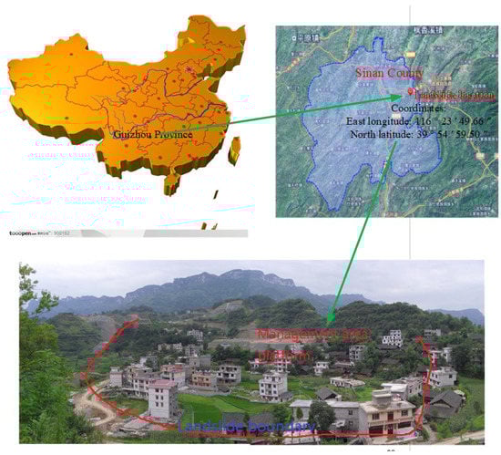 The landslide area is located in the intermountain depression between Tianjiaba and Tudiwan villages in the Sinan County, Tongren City, Guizhou Province, at the k1460–k1410 section of Hangrui Expressway (G56). Its geographic coordinates are 116°23′49.66″ E and 39°54′59.50″ N. To meet the needs of the project, a management area platform with a length of 220 m, a width of 120 m, and a height of 13–17 m was developed in the middle of the depression. The slope sliding occurred due to the platform in the filling management area and the excavation of a ramp and connecting line embankment on the north and south sides of the platform. From the night of 2 July 2011 to the morning of 3 July 2011, a large range of cracks occurred in the southwest corner of the filling platform and its outer side of Tudiwan and Tianjiaba villages. The cracks developed rapidly, leading to most of the houses becoming dangerous to occupy.