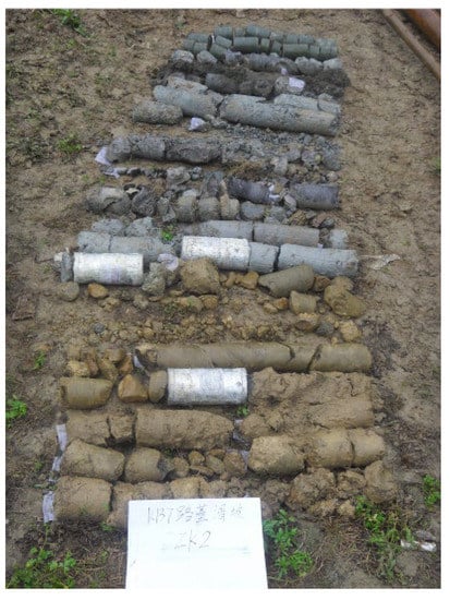 In addition to artificial filling of the platform in the rear management service area, the overburden layer of the site consisted of eluvial and deluvial silty clay, mixed gravel clay, colluvial and deluvial gravel, block stone, and mixed silty clay gravel. The underlying bedrock consisted of a nearly horizontal occurrence of strongly weathered and moderately weathered mudstone with a strata dip angle of 230° to 270° and dip angle of 3° to 5° with argillaceous and layered structures. The fracture surface was severely stained by ferromanganese. The sliding zone soil was silty clay both above the bedrock surface and close to the bedrock surface. The silty clay was softened and argillized by groundwater to form a weak zone in the form of soft plastic to flow plastic. The buried depth was generally 5–19 m. The north, east, and south sides outside the landslide area were bedrock exposed areas, with local overburden thickness of 1–3 m and exposed bedrock in the gully. Figure 2 shows the core.