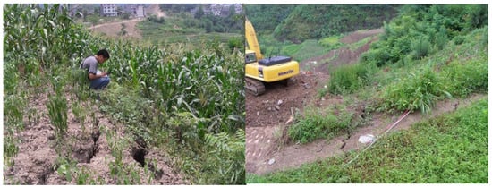 When engineering construction is conducted in mountainous areas, high platforms or buildings are often developed on the slope to break the original equilibrium state of the slope and the slope can slide downward [6,7,8,9]. During a landslide a large number of cracks arise, such as tensile cracks in the back wall of the landslide, fan-shaped tensile cracks in the front edge, shear cracks in the perimeter of a landslide, bulging, and tension cracks in the landslide [10,11,12,13]. In soil landslides, the sliding direction of the landslides is usually perpendicular to the direction of tension and bulging cracks [14,15,16]. The strike of shear fracture is usually perpendicular to the strike of the slope and, in most cases, it is relatively straight [7,17,18]. For rock landslides, the occurrence and nature of fractures are mainly controlled by structural planes [19,20,21].