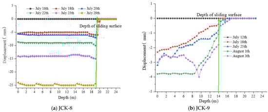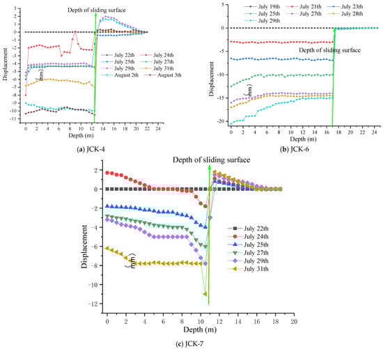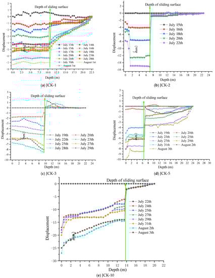 Ten deep displacement (borehole) observation holes were arranged in this survey. Figure 5 shows the analysis results of observation data from the deep displacement observation holes. The JCK-2 inclined hole was cut short at 7 m on 23 July, theJCK-3 inclined hole was cut short at 9.5 m on 30 July, the JCK-6 inclined hole was cut short at 17.5 m on 30 July, the JCK-7 inclined hole was cut short at 11 m on 1 August, and the JCK-8 inclined hole was cut short at 19 m on 30 July. JCK-2,3,6,7,8 inclinometer holes were all cut short at the sliding surface.