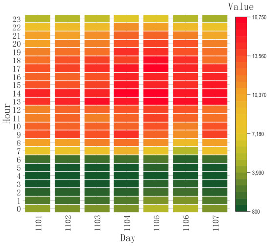 The frequency distribution of resident trips during the study period is shown in Figure 4. The most popular travel time was Saturday at 5:00 p.m. (5 November), with 14,901 cab orders occurring in one hour. Orders were higher on Mondays, Fridays, and Saturdays during the study interval, while 1:00 p.m., 2:00 p.m., and 5:00 p.m. are the most active times of the day for urban traffic.