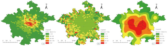 Thermogram of trip frequency. (Subplot (A) shows the order density distribution, subplot (B) shows the average order length distribution, and subplot (C) shows the public transportation density distribution).