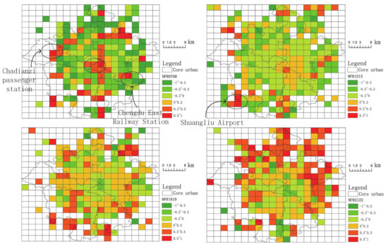 Figure 6 shows the calculation results of NFR for different areas of the city. During the morning peak hours, the flow of people is directed to the city center as well as to various passenger stations (airport, passenger station, railway station). At night, the city center and passenger stations basically show a net outflow. The northern and eastern parts of the study area have increased attractiveness, presumably these areas have more residential areas.