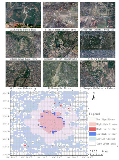 Correspondingly, the “low-low” agglomerations are mixed with “high-low” (marked in red) spatially anomalous areas that have far more cab orders than the surrounding areas. These areas are: Panda Base (A), Large Hospital (C), Airport (H), and Logistics Center. The appearance of spatial anomalies is closely related to the urban functions of the spatial grid.