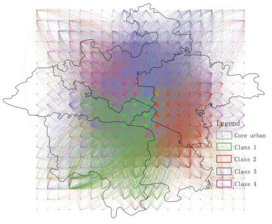If we consider a city as an essay, and the grids with different attributes in the city as “words”, then the communities composed of a set of grids can be seen as “segments” of the essay. The internal content of a “paragraph” is highly correlated, and there are distinctions between “paragraphs”. For an article, we can easily distinguish the exciting content of different paragraphs. Similarly, we can parse the urban structure by using community detection algorithms [25]. In addition to the spatial analysis method being used to extract the spatio-temporal characteristics of trajectories, the network science method can also be used to make the analysis results more diverse and richer by using quantitative indicators such as the number of nodes, degree centrality, and graph density.