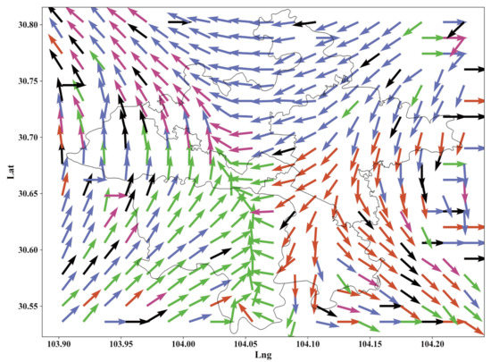The community detection method has proven to be an effective tool in urban planning [45]. The impact of railroads and trunk roads on community boundaries is more pronounced than that of administrative boundaries. In addition, we calculate the weighted average of azimuth angles between OD points in different areas and construct direction vector field to represent the directionality of different locations. As shown in Figure 9, the arrows indicate the OD direction of each grid.