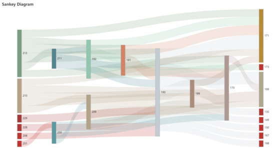 We constructed a new local network from these key nodes and examined the traffic flow between them. The width of the edges is shown proportionally to the traffic flow; the wider the edge, the larger the value. As can be seen from the Sankey diagram in Figure 11, the grid node with ID 190 receives the most traffic flow, showing the scale-free characteristics of the local network (a small number of nodes enjoy most of the traffic).