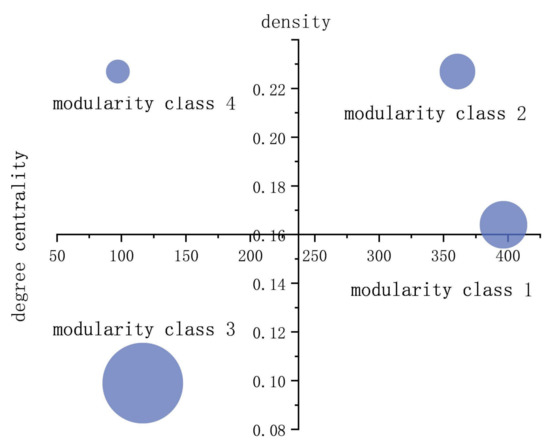 Graph density measures the strength of internal associations between modular classes in a network, and a high value means that the community has a higher density of spatial nodes and more frequent internal connections. Centrality to measure the local traffic frequency of the network. Comparing the attributes of these four communities, it can be seen from Figure 12 that the density of communities 1, 2, and 4 is higher than the average density of the entire network (0.115). The detailed attributes of these communities are presented in Table 2. In general, the attributes of the four communities are significantly different from each other, and the correlation between the communities is not high.