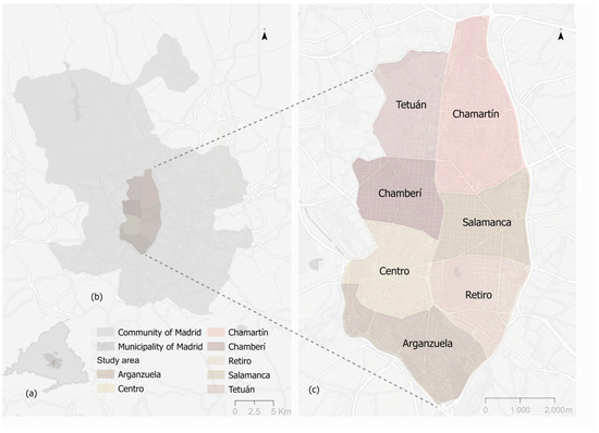 Study area (a) community of Madrid, (b) municipality of Madrid, and (c) central part of the city of Madrid.