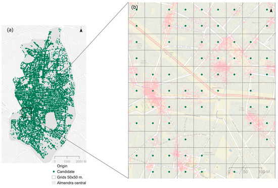The candidate locations for the parking spaces were those cells that totaled more than five starting points for trips. With this selection, the number of candidates in the implementation of the location models is reduced, eliminating cells with very low demand. In total, there were 7735 candidate locations (Figure 3a), covering the area of the study with a high spatial level. Figure 3b shows how, with this selection, most of the demand is covered, and regularly distributed candidates are obtained.