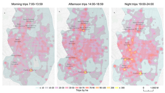 Figure 5 shows the distribution of demand grouped into the three-time bands under consideration. The system is used most at night, with average densities above 19 origins per hectare and values of over 200 origins per hectare in many zones in the center of the city (Table 2). In contrast, the use of the system is much lower in the morning band, despite the band being 2 h longer. The afternoon presents an intermediary situation between the above two. As well as differences in the number of trips, there are also differences in their spatial concentration. In the morning, the spatial distribution is more homogenous, and the more residential zones have intensities similar to the zones with economic activities, as shown in the maps and lower coefficients of variation in this time band (Table 2). In the afternoon, the greatest densities are concentrated in areas of economic activity, such as the office zone of Azca. At night, in turn, the distribution is more unequal, with densities of origins of trips being very high in leisure and restaurant areas of the Centro district.