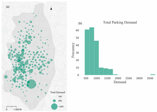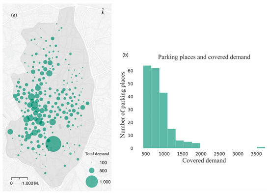 Optimized scenario: (a) Distribution of final parking spaces with the allocated demand. (b) Covered demand distribution by parking places.