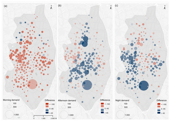 Figure 7 shows the demands allocated to each parking space according to time band (size of the symbols) and the differences between the demand allocated to each of the locations of the parking spaces between the time bands. The demand allocated to the parking spaces in the morning is much more homogenous than in the afternoon and at night, so although the most central parking spaces have greater allocated demand, the differences with respect to the more peripheral parking spaces are reduced and the only outstanding location is the parking space around Atocha station (in all three time bands). In contrast, in the afternoon the demand for parking spaces in the central areas and the areas of activity, particularly the Prado-Recoletos-Castellana axis, increases strongly, while the demand allocated to the parking spaces in the more peripheral residential areas is reduced. At night, these parking spaces in the Prado-Recoletos-Castellana axis once more lose allocated demand, while it is increased in the shopping and leisure areas of districts, such as Centro, Chamberí, and Salamanca.