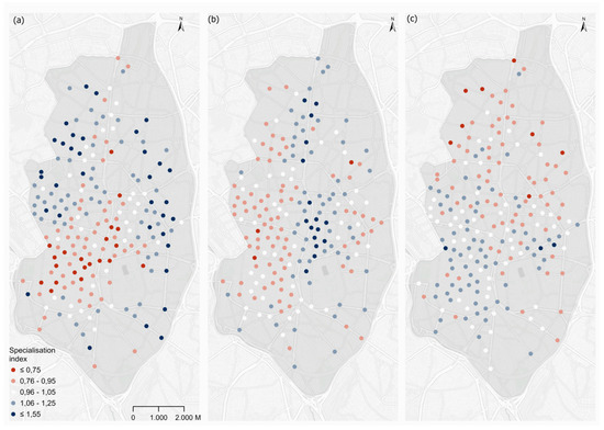 The results show very clearly the differences in the specialization of the stations according to the spaces with greater weight in residential areas in the morning (blue in the morning band), the office worker zones (blue in the afternoon), and leisure and restaurants (blue at night). The situation at night, when demand is greatest and, therefore, has the greatest influence in the reference scenario, has the lowest levels of specialization (values of around 1 and clear colors), while, in the morning, there are parking spaces that have a great deal of importance at that time (residential, with intense blue), or much less (areas of business activity, in red).