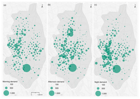 In addition, four-time scenarios were considered. The reference scenario took into account the distribution of total demand over the day, thus considering the demand of each cell as the sum of all the origins produced in it. This scenario was compared with three partial time scenarios (that considered the distribution of demand in each of the three-time bands into which the data were divided: morning (07:00–13:59), afternoon (14:00–18:59), and night (19:00–00:00).