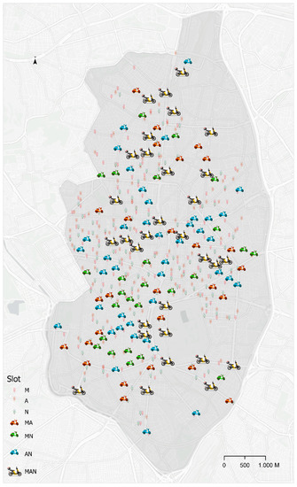 In this study, GIS location-allocation models were used in order to find the best locations for parking micro-mobility system vehicles. Unlike previous works which have implemented the same methodology for free-floating bike sharing (e.g., References [7,27]), in this paper, we worked with a moped-style scooter and incorporated a dynamic perspective with respect to supply and demand. Our proposal used a set of data provided by the company Muving, which are collected from the GPS records of trips made by users.