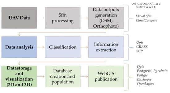 The final goal is to create a unique web-based framework in which different actors can share results, and advanced characteristics and parameters. Indeed, to reach and validate the OS workflow, a selected vineyard area was chosen as a case study. In this way, each step of the workflow was tested and evaluated showing the reliability of the whole process. Section 2 of this paper presents the materials used, including some considerations regarding the PA’s spatial database and the methodology’s workflow, showing FOSS tools adopted from data acquisition to data store. Section 3 illustrates this method’s outcomes by the data analysis and classifications results, data visualisation and web publication. Section 4 describes discussions, conclusions, and future developments.
